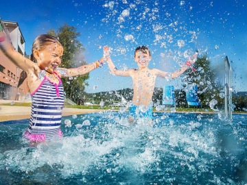 Beide Schwimmbecken werden auf 27 °C beheizt – und beide sind gleich tief (1,35 m). Packen Sie sofort Ihr Badezeug ein!