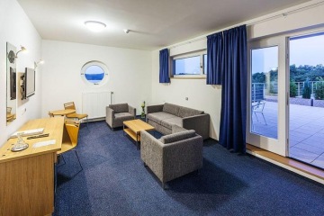 Wählen Sie entweder das Appartement BOARD in der 1. Etage mit 2 Balkons, das mit dem benachbarten Doppelzimmer verbunden werden kann, oder das Appartement COCKPIT in der 2. Etage mit geräumiger Privatterrasse inkl. Sitzgruppe.